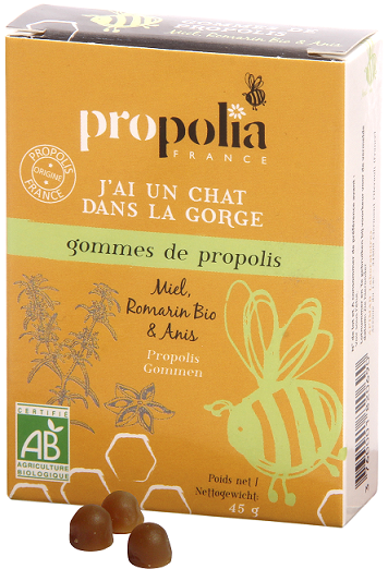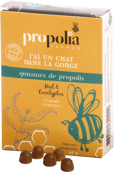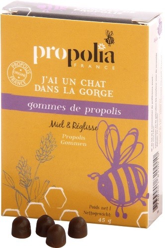 Adoucissent la gorge et purifient l’haleine (2,5 % d’extrait pur de propolis). 45 g. Gommes miel réglisse. Agréables à sucer, les Gommes de propolis adoucissent la gorge et parfument durablement l’haleine grâce à la Réglisse. Idéales dans la poche ou le sac, elles vous accompagnent partout. Sucer 5 à 6 gommes par jour.