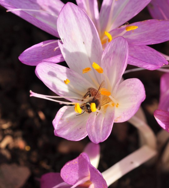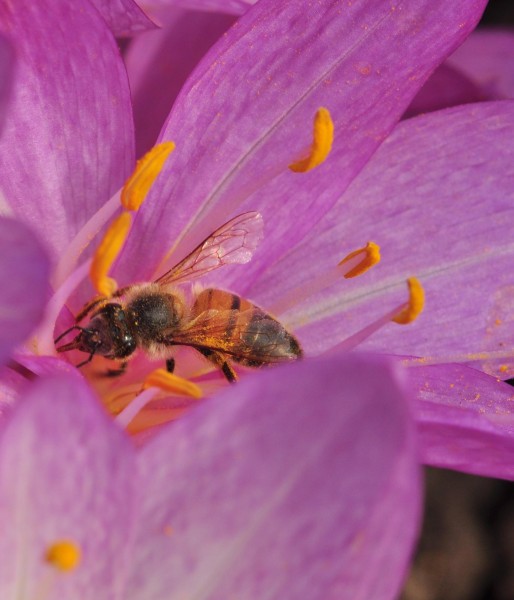 Lorsqu’on observe les abeilles butiner des fleurs de colchique on les voit récolter du pollen directement au niveau des anthères, du nectar au fond de la coupe florale mais aussi lécher les tépales.