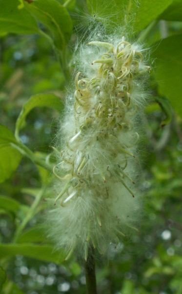 Chaque fleur femelle du chaton évolue en une capsule qui éclate en libérant une importante quantité de graines soyeuses disséminées par le vent. Dans certain cas cette abondance évoque la neige comme ici le long d’un chemin en mai.