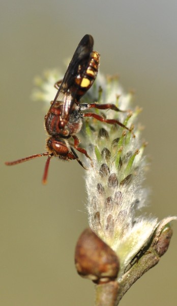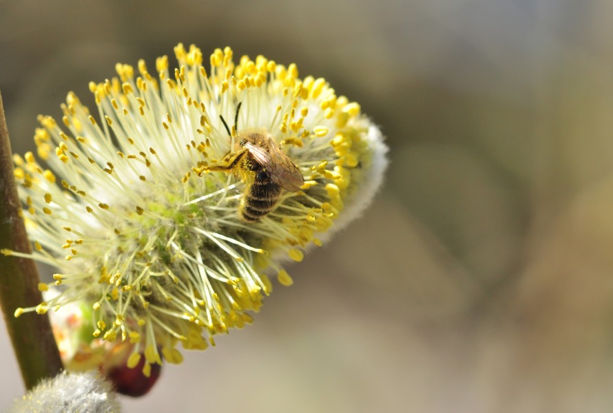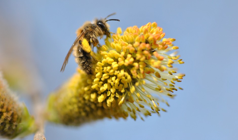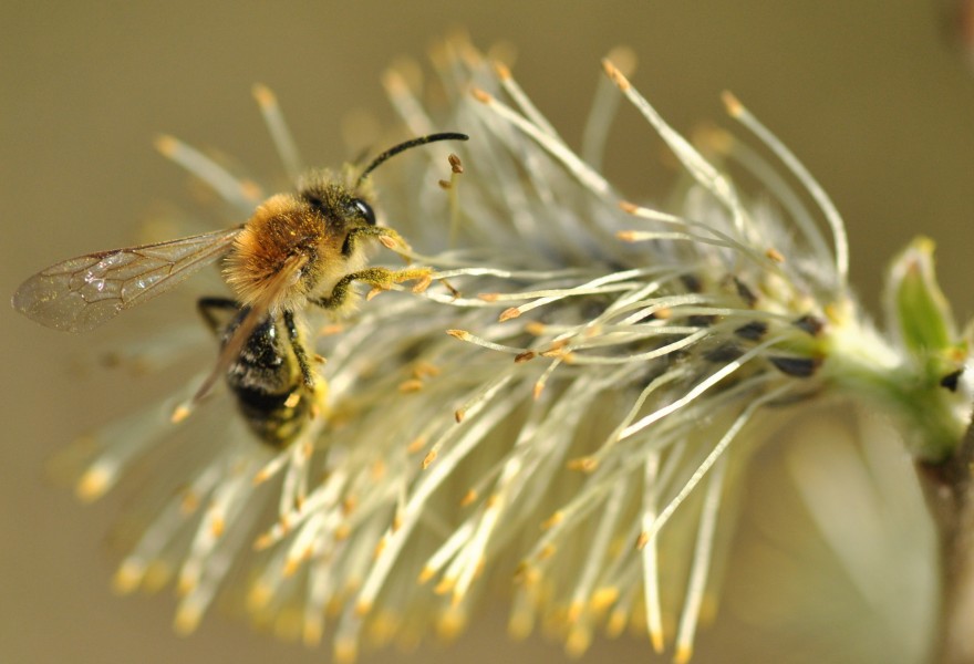 Outre l’abeille mellifère, les chatons mâles et femelles du saule des chèvres attirent de très nombreuses espèces d’abeilles solitaires parfois spécifiques.