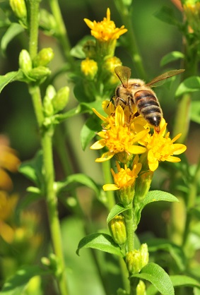 La verge d’or présente dans les jardins est une espèce très mellifère originaire du Canada (Solidago canadensis) actuellement classée avec le solidage géant (Solidago gigantea) comme espèce invasive des zones humides.