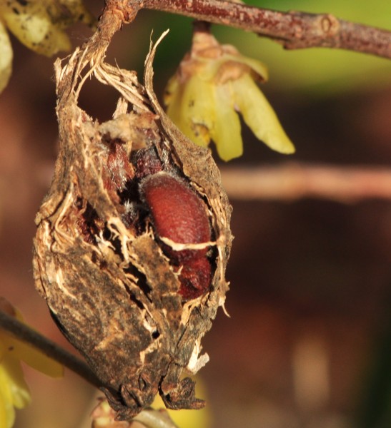 puisqu’il signifie précoce ! L’autre nom spécifique fragrans provient également du latin et signifie odorant, parfumé. Pour attirer les rares pollinisateurs au coeur de l’hiver, la sélection naturelle a favorisé deux stratégies, soit une couleur voyante, soit un parfum envoûtant. Le chimonanthe précoce a opté pour les deux.